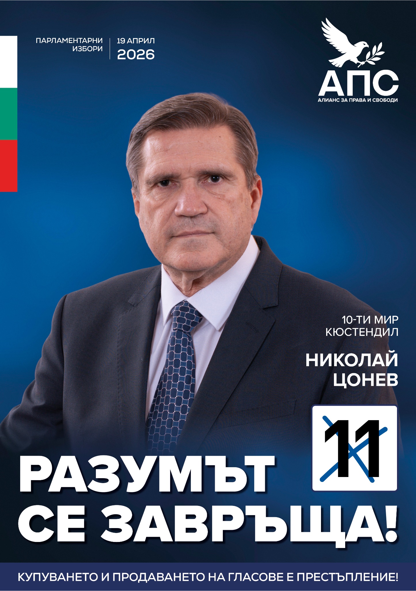 Бившият министър на отбраната Николай Цонев влиза уверено в надпреварата в 10 МИР – Кюстендил като водач на листата на АПС с бюлетина №11, отправяйки ясно послание: край на двойните стандарти и задкулисието.