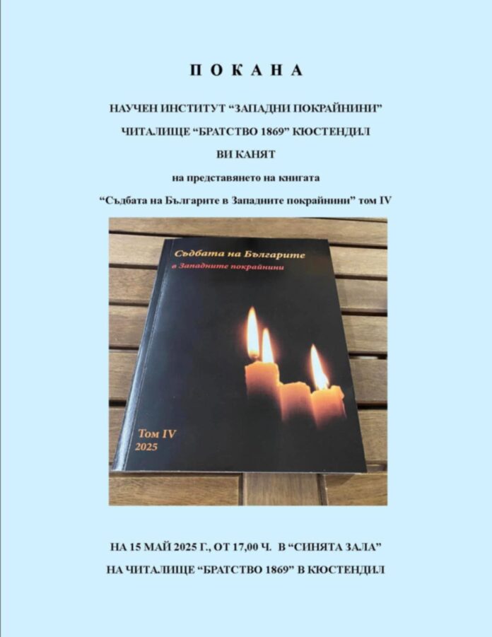Научният институт „Западни покрайнини“ и читалище „Братство 1869“ – Кюстендил ще представят в Кюстендил книгата „Съдбата на българите от Западните покрайнини“ том IV. Събитието ще се състои на 15 май в читалището, съобщиха от научният институт.